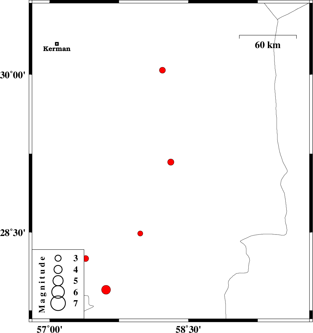 | 2015/05/18 | 11:03:31.3 | 15:33:31.3 | 30.04 | 58.22 | 15 | ML:3 | Kerman Province, 105 km North-West of Bam | ||
