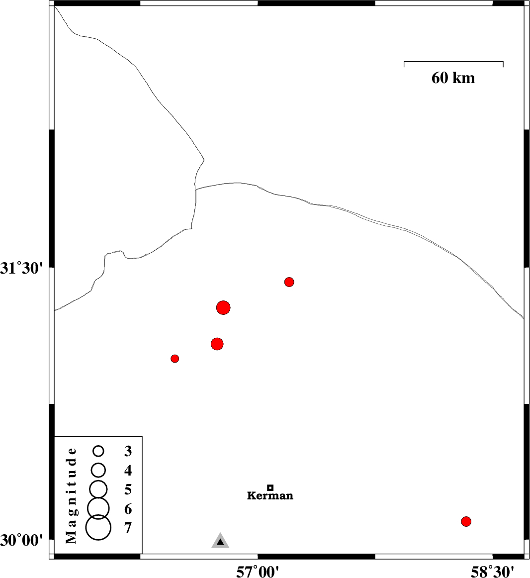 | 2015/06/02 | 06:13:29.9 | 10:43:29.9 | 31.42 | 57.2 | 14 | ML:2.7 | Kerman Province, 41 km North-East of Ravar | ||