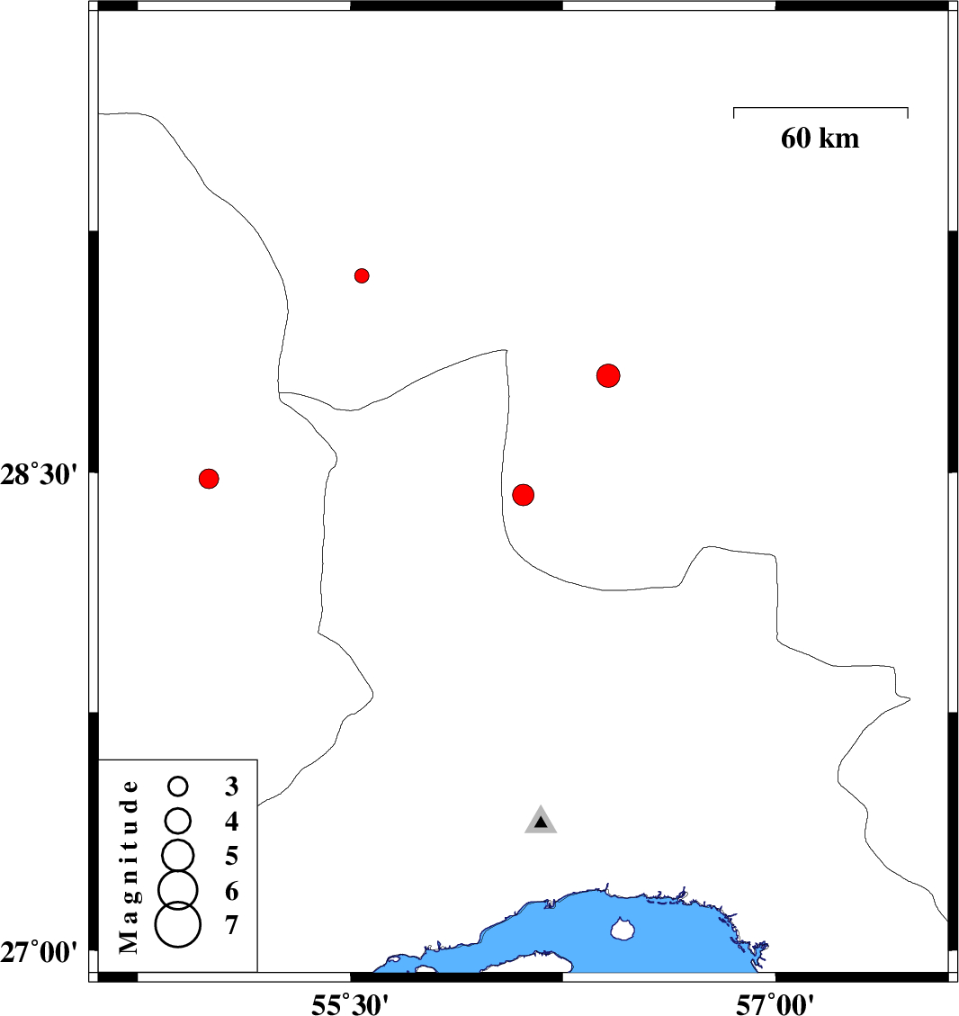 | 2015/06/04 | 23:38:10.4 | 04:08:10.4 | 28.43 | 56.11 | 14 | ML:3.4 | Kerman Province, 25 km North-East of Hajiabad | ||