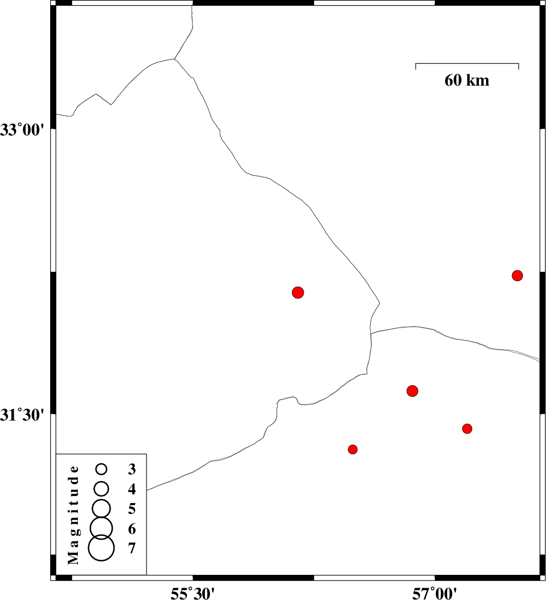 | 2015/06/09 | 09:54:17.1 | 14:24:17.1 | 32.14 | 56.15 | 14 | ML:3.2 | Yazd Province, 93 km North-East of Bafq | ||