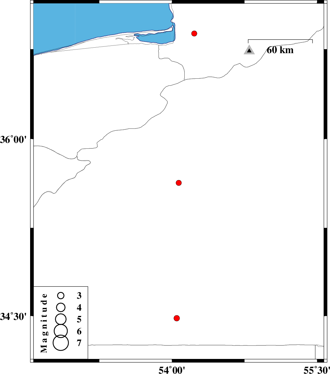 | 2015/06/14 | 04:46:30.8 | 09:16:30.8 | 36.88 | 54.23 | 18 | ML:2.6 | Golestan Province, 14 km East of Bandar-e torkaman |