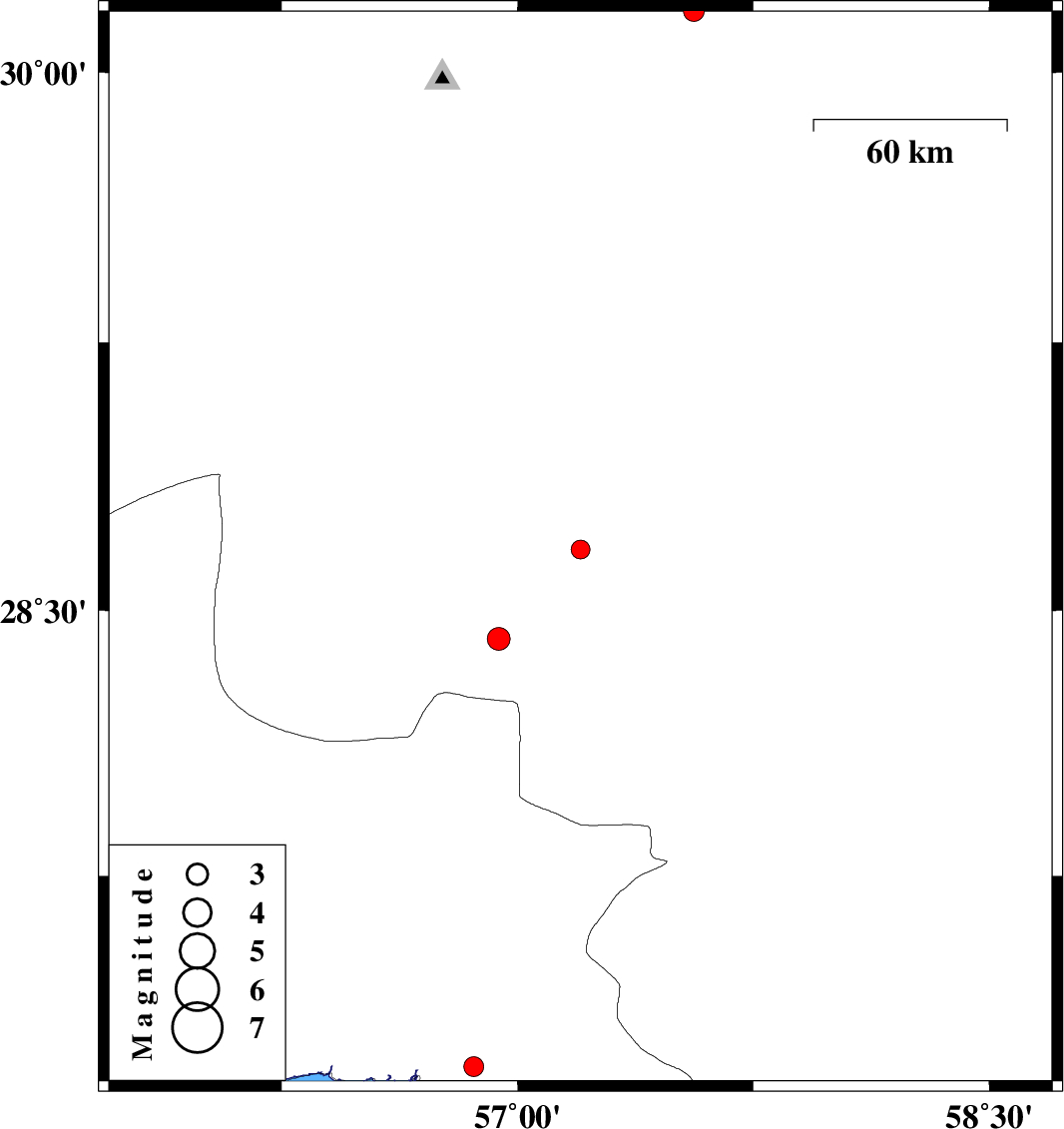 | 2015/06/21 | 02:44:32.6 | 07:14:32.6 | 28.67 | 57.2 | 14 | ML:2.7 | Kerman Province, 53 km West of Jiroft | ||
