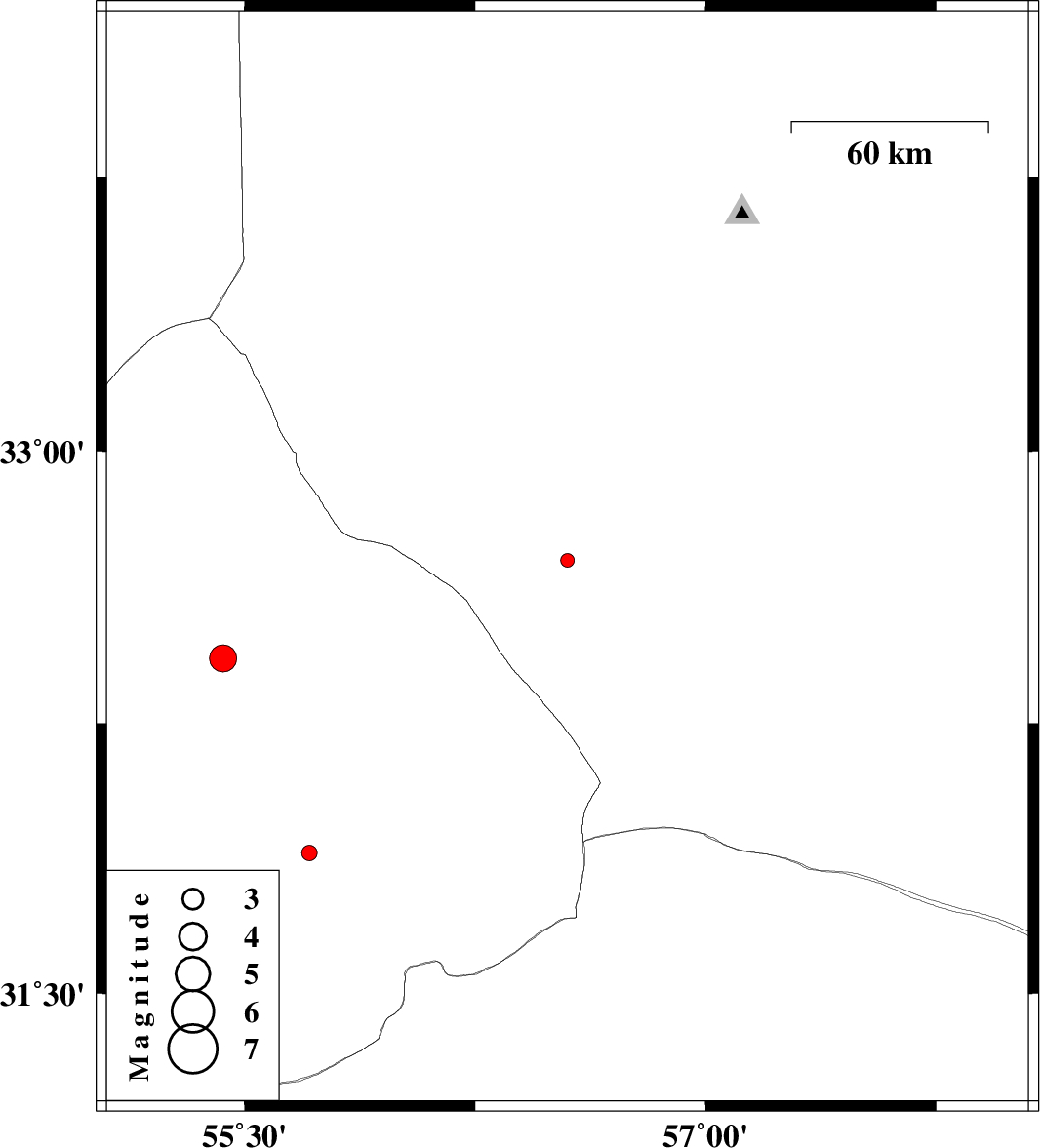 | 2015/06/22 | 07:17:12.8 | 11:47:12.8 | 32.7 | 56.55 | 14 | ML:2 | Yazd Province, 106 km South-West of Tabas | ||