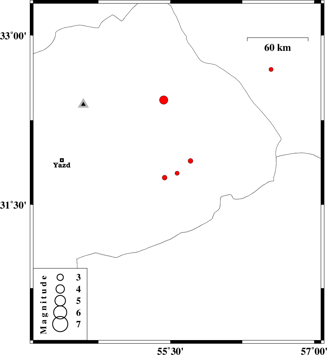 | 2015/06/17 | 23:05:43.2 | 03:35:43.2 | 32.43 | 55.43 | 14 | ML:4 | Yazd Province, 91 km North of Bafq |