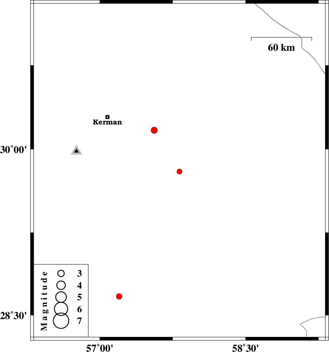 | 2015/06/23 | 07:22:54.3 | 11:52:54.3 | 29.8 | 57.82 | 17 | ML:2.4 | Kerman Province, 126 km North of Jiroft | ||