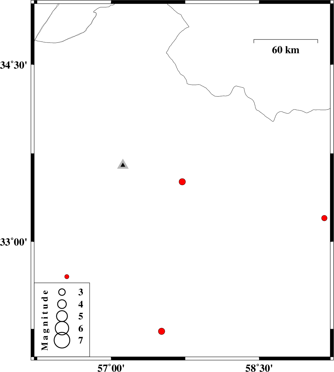 | 2015/06/22 | 07:17:12.8 | 11:47:12.8 | 32.7 | 56.55 | 14 | ML:2 | Yazd Province, 106 km South-West of Tabas | ||