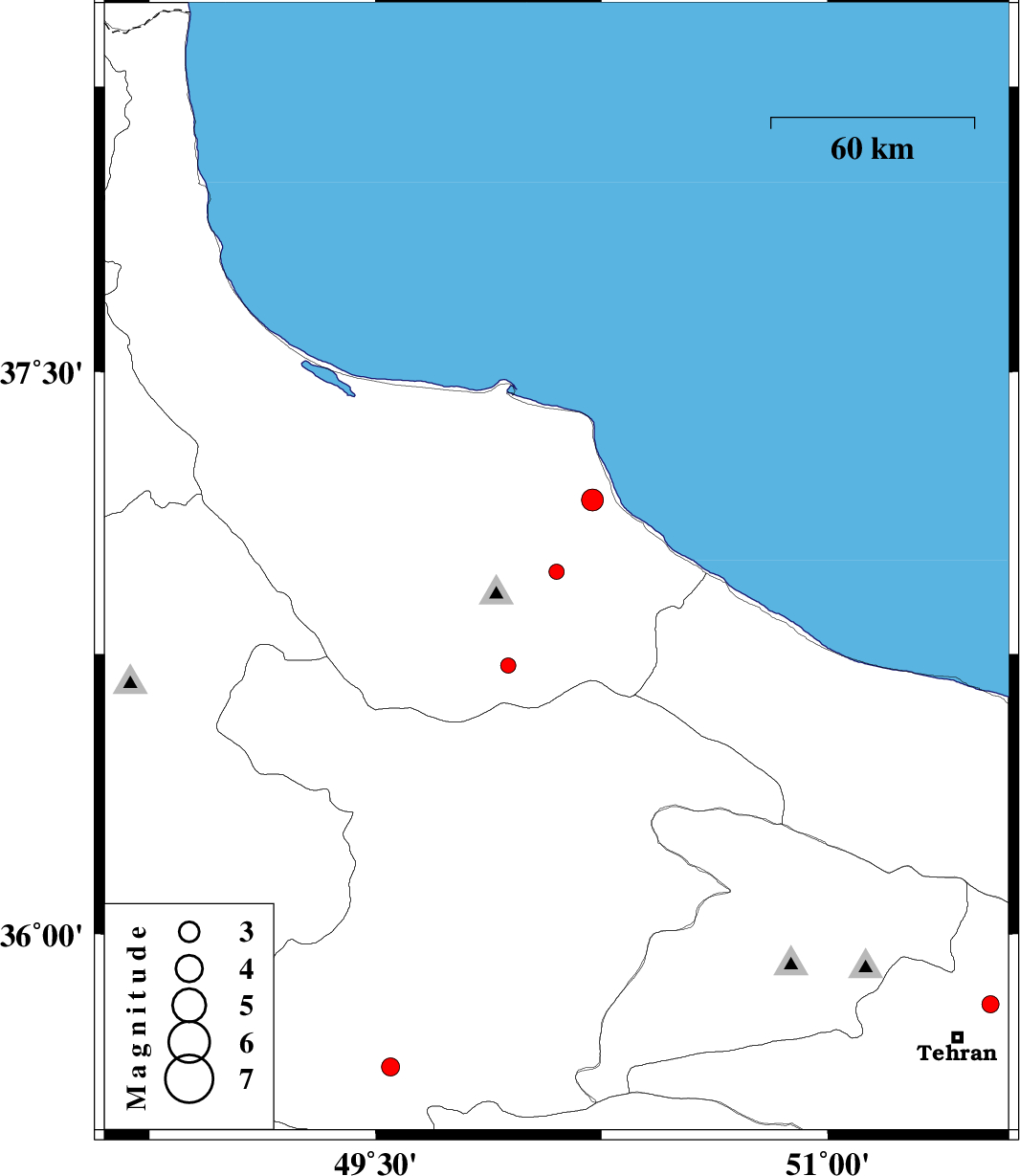 | 2015/06/22 | 07:36:19.7 | 12:06:19.7 | 36.72 | 49.94 | 17 | ML:2.2 | Gilan Province, 48 km South of Siahkal | ||