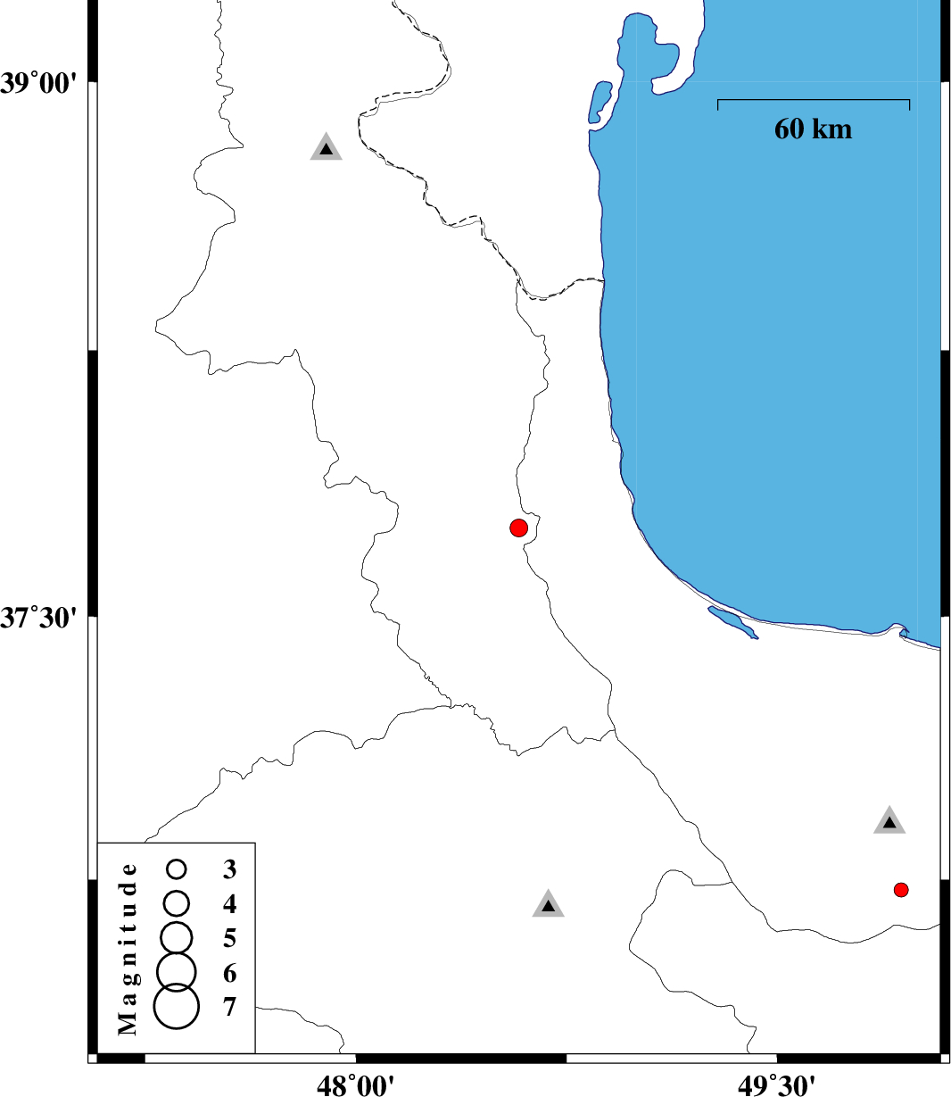 | 2015/06/22 | 07:36:19.7 | 12:06:19.7 | 36.72 | 49.94 | 17 | ML:2.2 | Gilan Province, 48 km South of Siahkal |