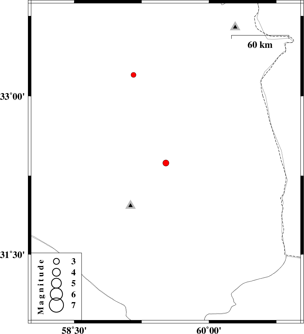 | 2015/06/28 | 13:38:53.4 | 18:08:53.4 | 32.37 | 59.52 | 14 | ML:3.1 | Khorasan(south) Province, 38 km South-West of Sarbisheh | ||