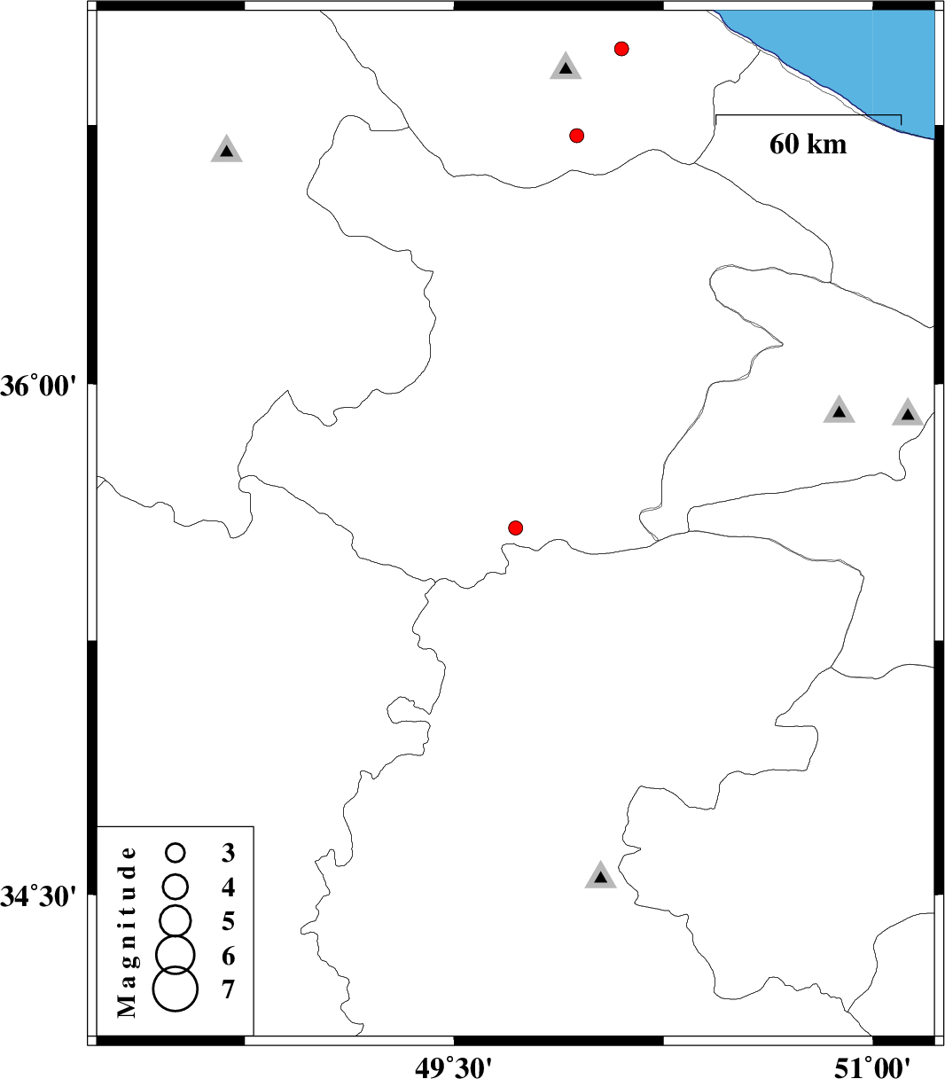 | 2015/06/22 | 07:36:19.7 | 12:06:19.7 | 36.72 | 49.94 | 17 | ML:2.2 | Gilan Province, 48 km South of Siahkal |