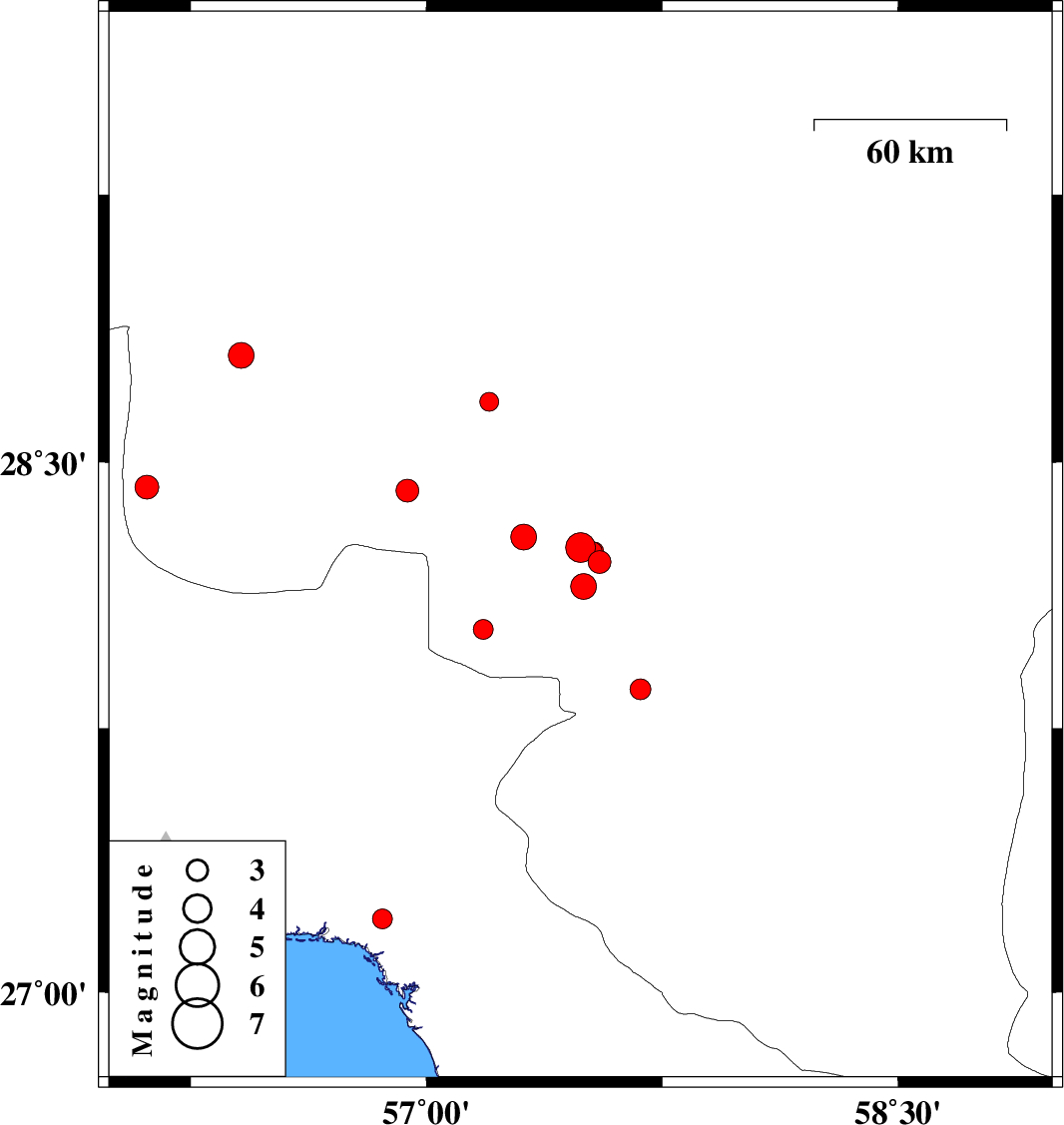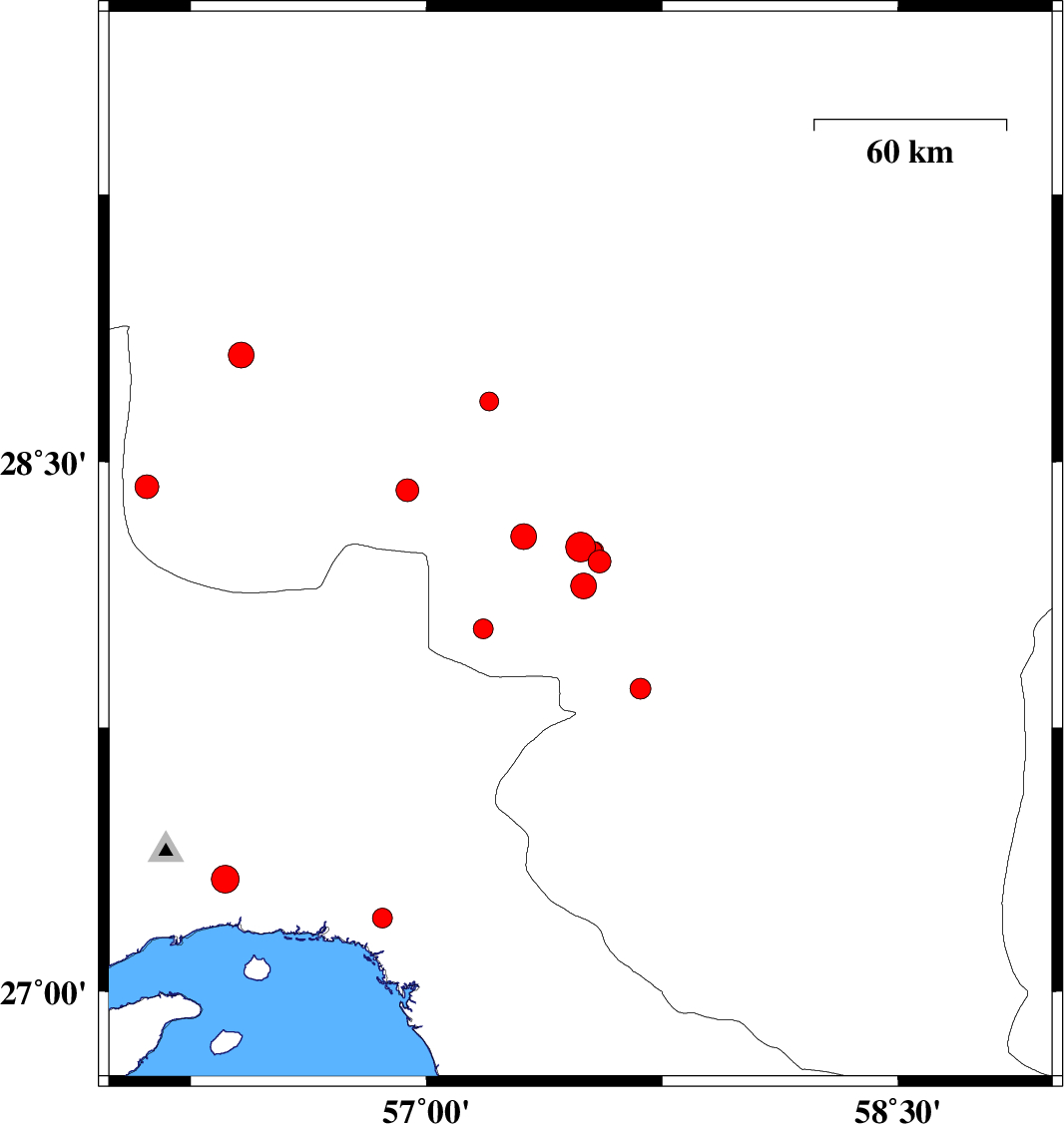 2015/07/01 06:45:56.4 11:15:56.4 28.1557.546 ML:3.7 Kerman Province, 29 km North-West of Kahnuj