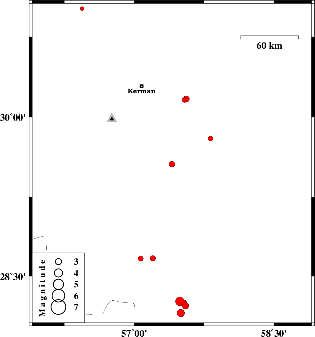 | 2015/07/17 | 19:55:01.3 | 00:25:01.3 | 29.558 | 57.404 | 18 | ML2.8 | Kerman Province, 87 km South-East of Kerman | ||