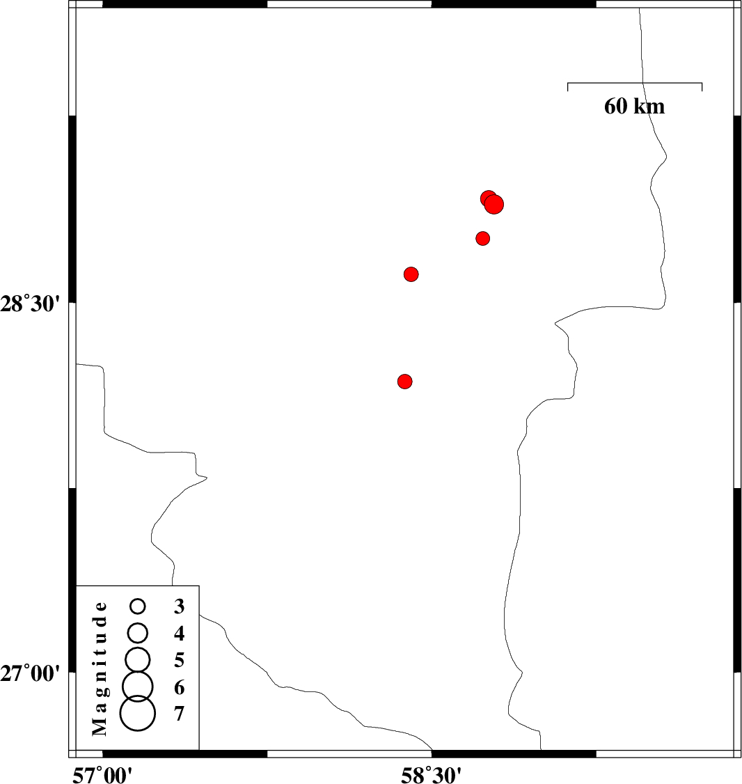 | 2015/07/20 | 14:54:15.1 | 19:24:15.1 | 28.614 | 58.406 | 18 | ML2.9 | Kerman Province, 55 km South of Bam |