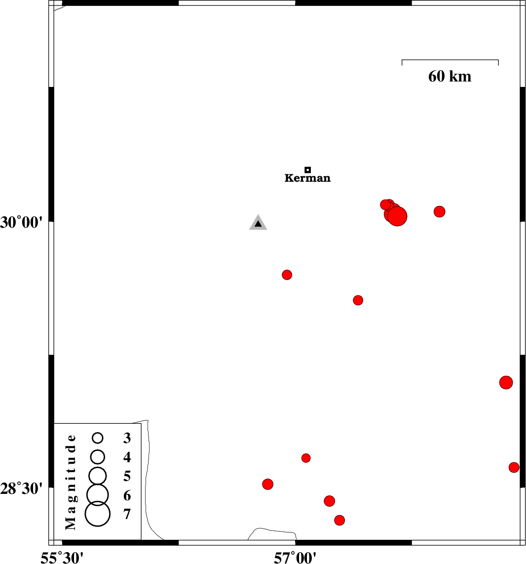 | 2015/07/20 | 14:54:15.1 | 19:24:15.1 | 28.614 | 58.406 | 18 | ML2.9 | Kerman Province, 55 km South of Bam | ||