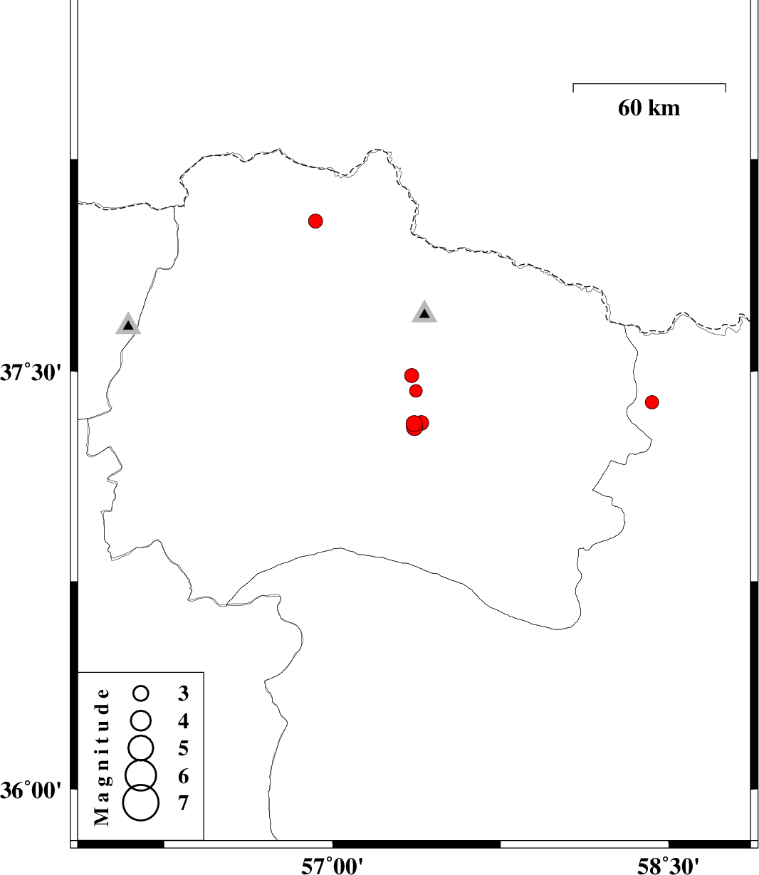 | 2015/08/06 | 06:51:58.9 | 11:21:58.9 | 37.316 | 57.396 | 14 | ML2.9 | Khorasan(north) Province, 18 km South of Bojnurd | ||