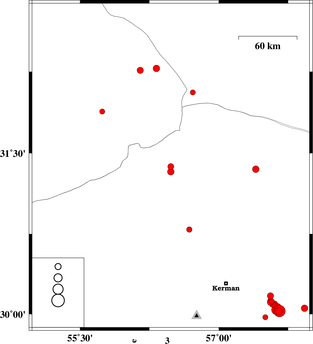 | 2015/08/09 | 13:45:12.8 | 18:15:12.8 | 29.971 | 57.504 | 30 | ML2.6 | Kerman Province, 54 km South-East of Kerman | ||