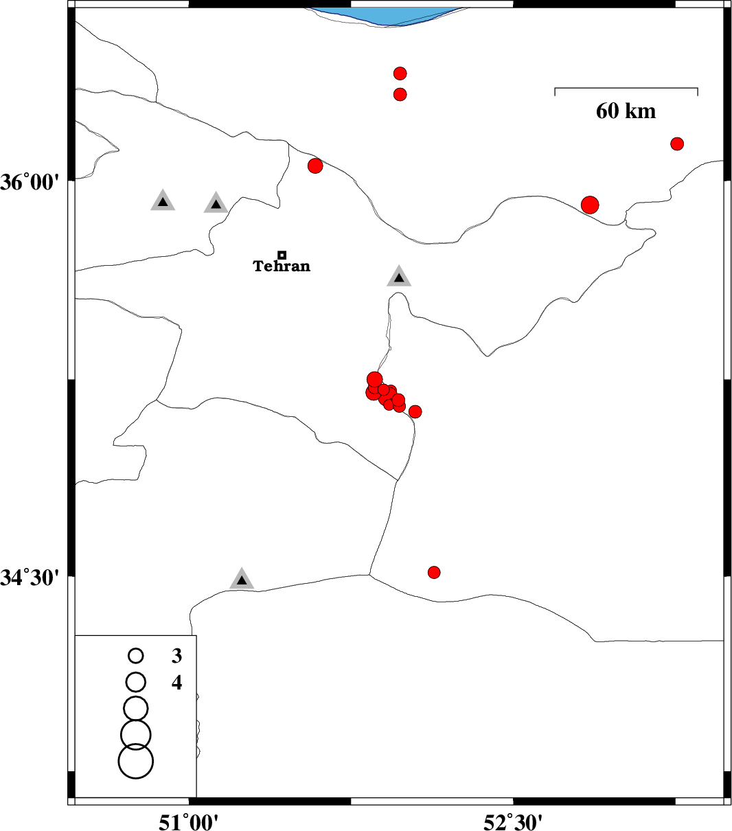 | 2015/08/13 | 18:42:11.7 | 23:12:11.7 | 35.185 | 51.919 | 9 | ML4.1 | Tehran Province, 28 km South-East of Varamin | ||
