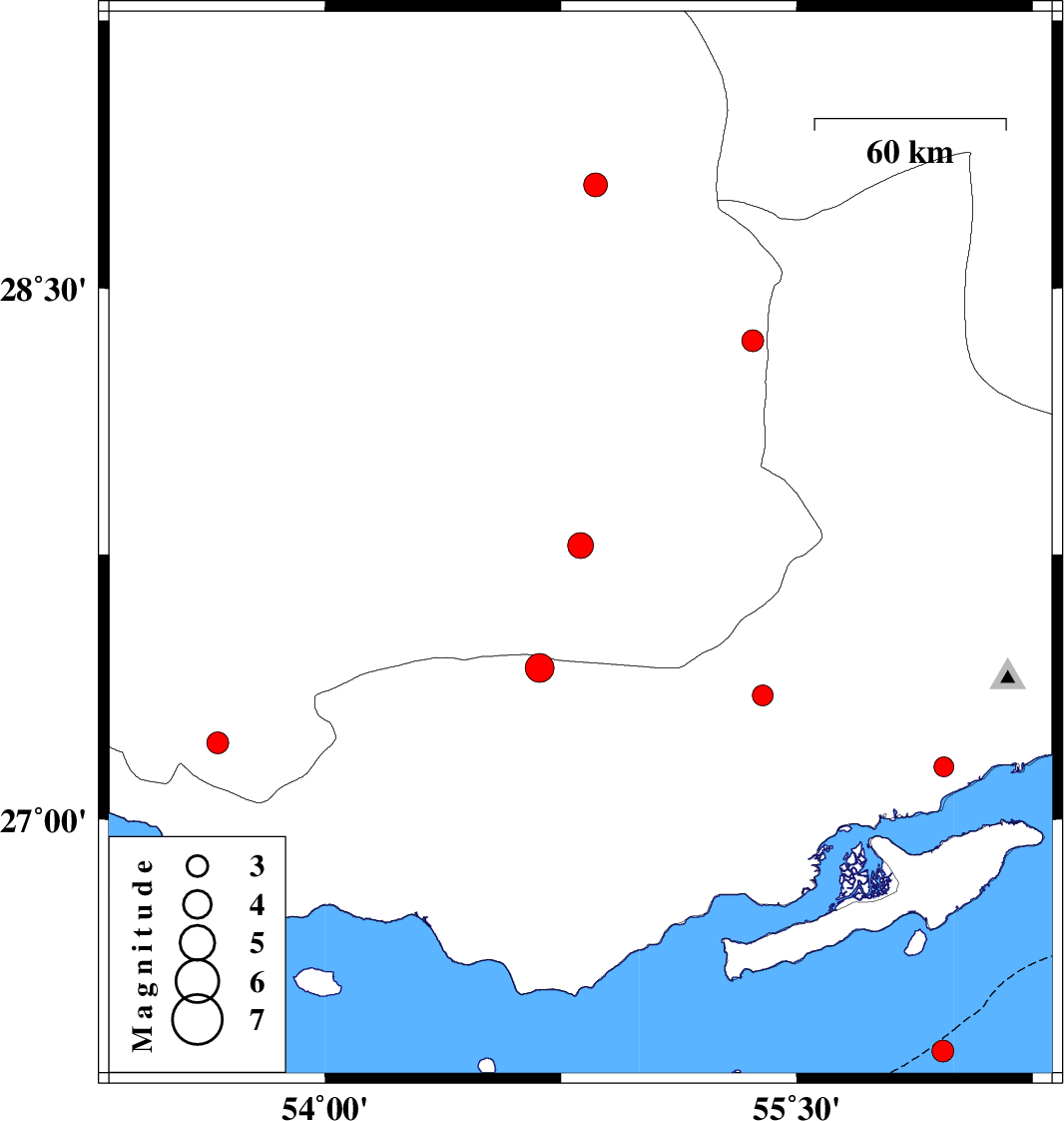 | 2015/07/27 | 14:47:23.9 | 19:17:23.9 | 27.216 | 53.658 | 14 | ML3.1 | Fars Province, 50 km South-East of Lamerd | ||