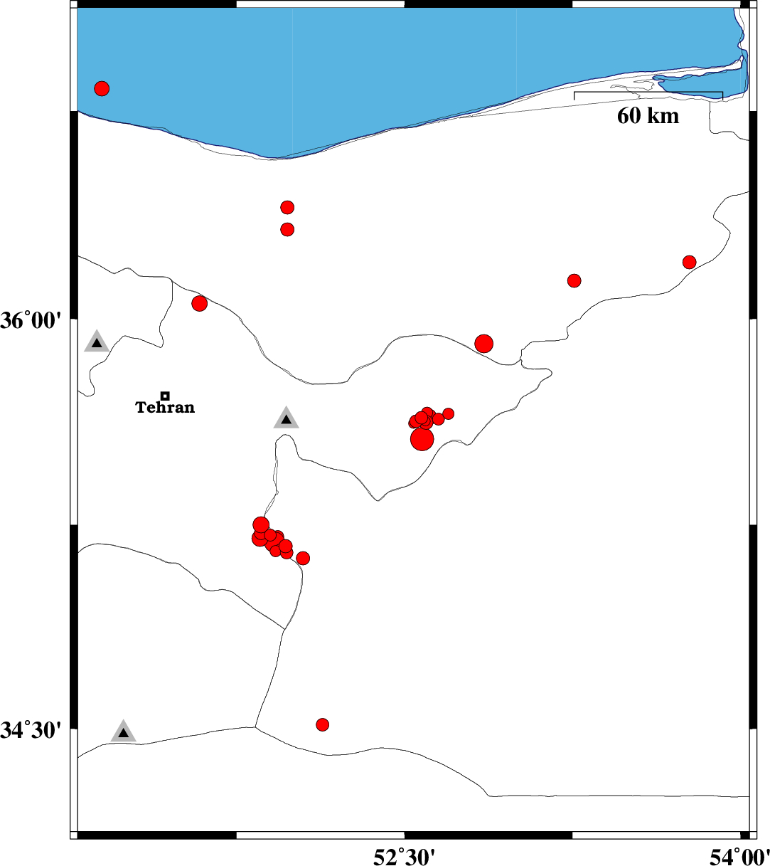 | 2015/07/30 | 06:19:25.2 | 10:49:25.2 | 35.127 | 52.047 | 14 | ML2.7 | Semnan Province, 28 km -West of Garmsar | ||