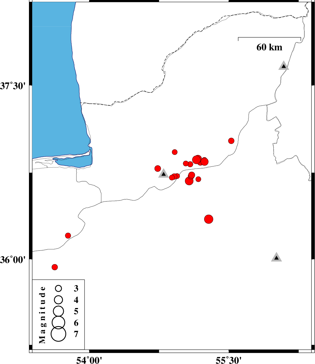 | 2015/08/29 | 07:52:36.9 | 12:22:36.9 | 36.719 | 55.094 | 6 | ML3 | Semnan Province, 33 km South of Ramian | ||