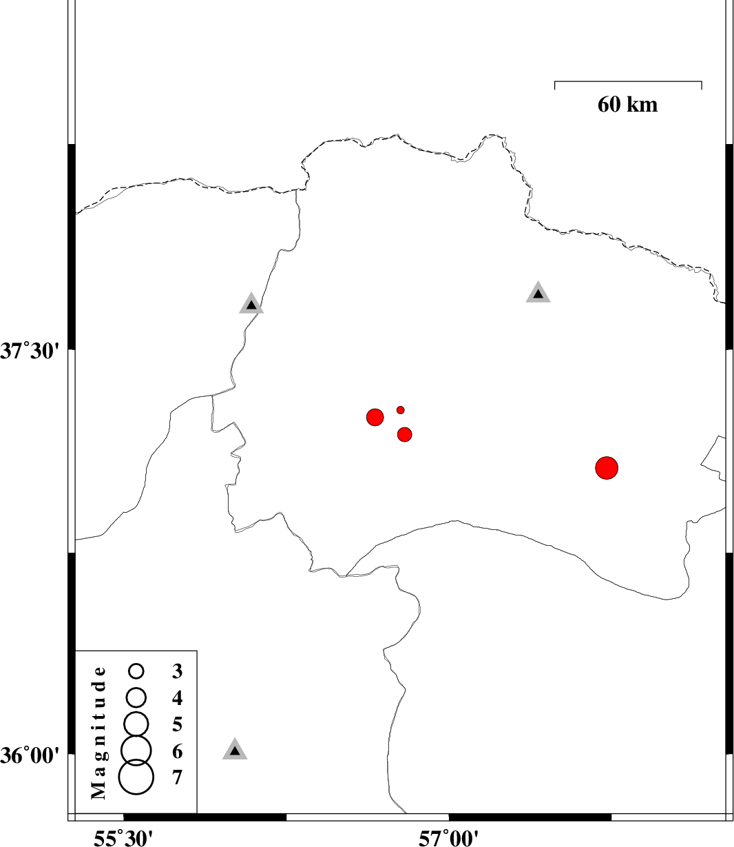 | 2015/08/31 | 02:15:08.8 | 06:45:08.8 | 37.277 | 56.776 | 46 | ML1.6 | Khorasan(north) Province, 34 km South-West of Ashkhaneh | ||