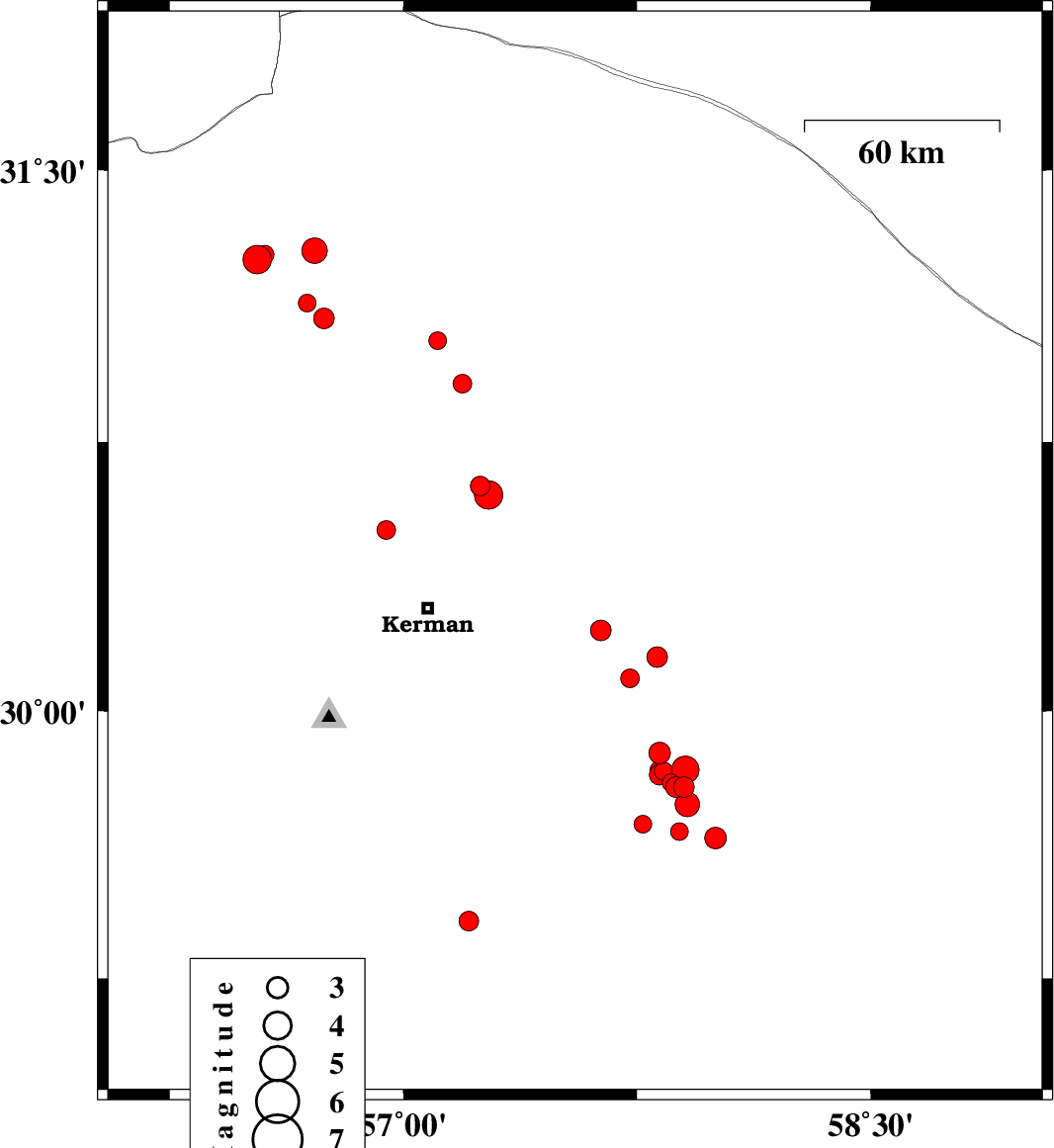 | 2015/08/09 | 13:45:12.8 | 18:15:12.8 | 29.971 | 57.504 | 30 | ML2.6 | Kerman Province, 54 km South-East of Kerman | ||