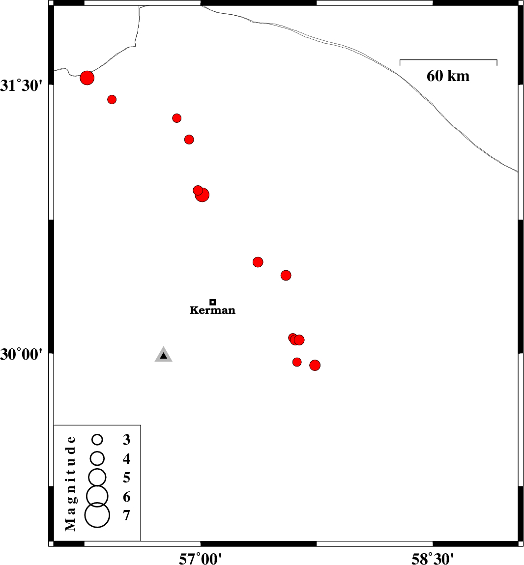 | 2015/08/26 | 21:46:29.7 | 02:16:29.7 | 30.075 | 57.637 | 14 | ML3 | Kerman Province, 59 km South-East of Kerman | ||