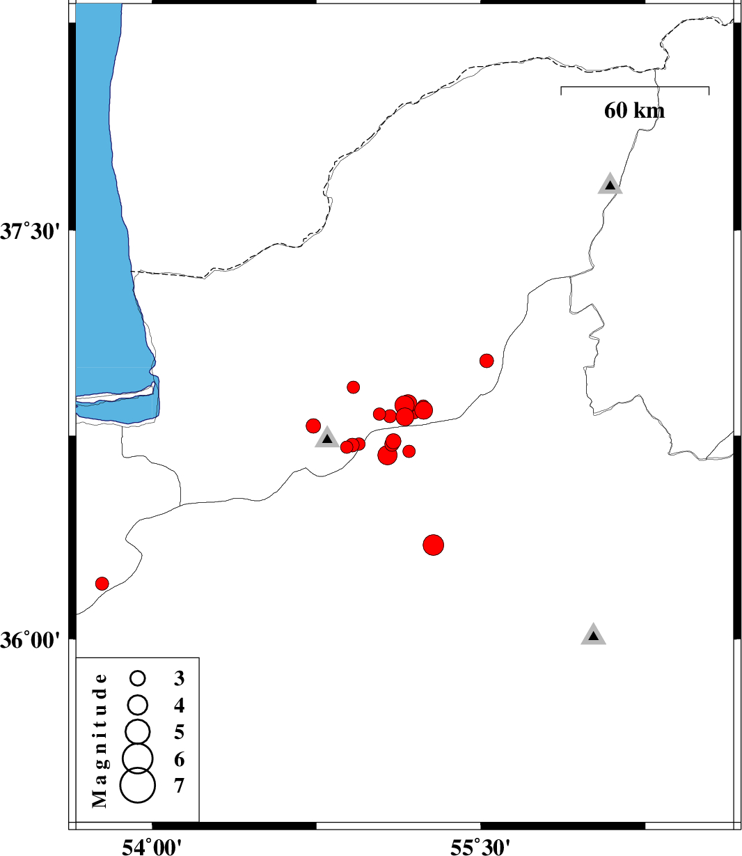 | 2015/08/29 | 07:52:36.9 | 12:22:36.9 | 36.719 | 55.094 | 6 | ML3 | Semnan Province, 33 km South of Ramian | ||