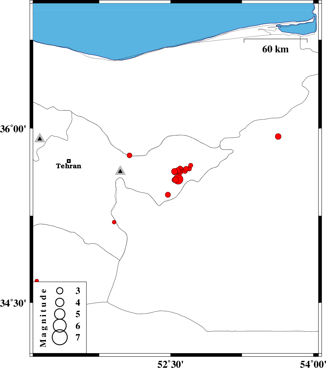 | 2015/08/25 | 18:03:16.7 | 22:33:16.7 | 35.619 | 52.54 | 14 | ML2 | Tehran Province, 25 km South-West of Firuzkuh | ||
