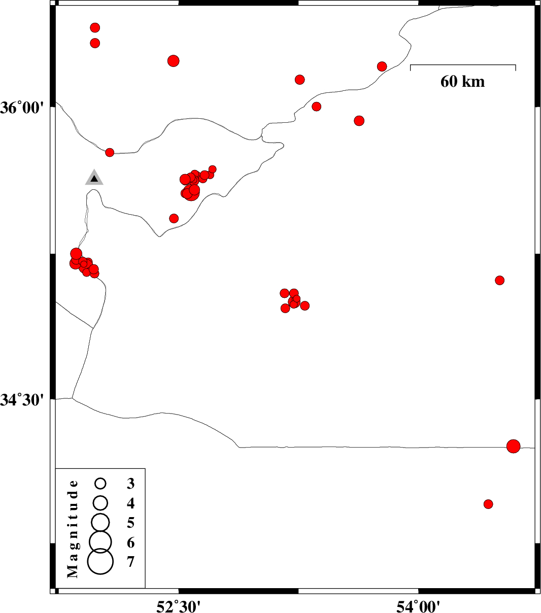 | 2015/09/05 | 00:11:41.7 | 04:41:41.7 | 35.002 | 53.223 | 15 | ML3.4 | Semnan Province, 65 km South-West of Semnan | ||
