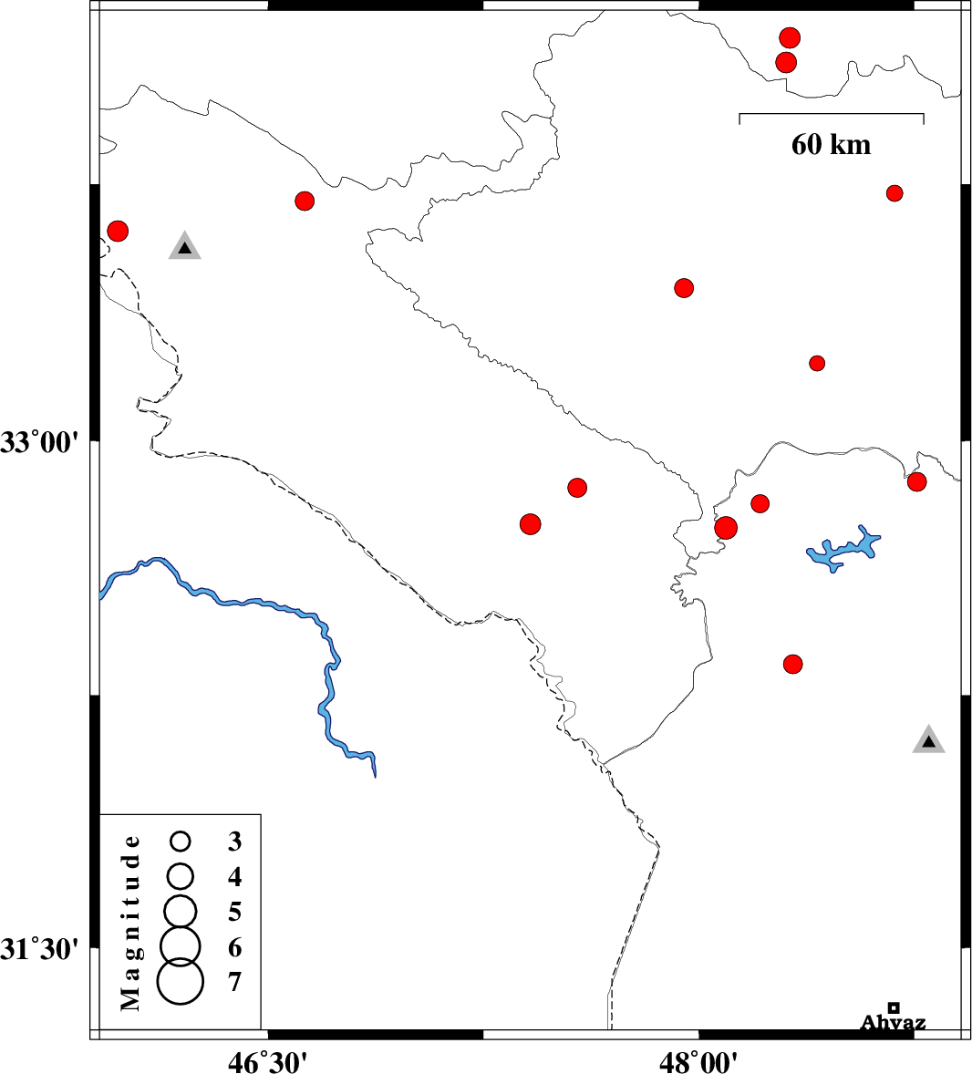 | 2015/08/25 | 18:58:18.7 | 23:28:18.7 | 32.863 | 47.576 | 14 | ML2.9 | Ilam Province, 13 km -East of Abdanan | ||