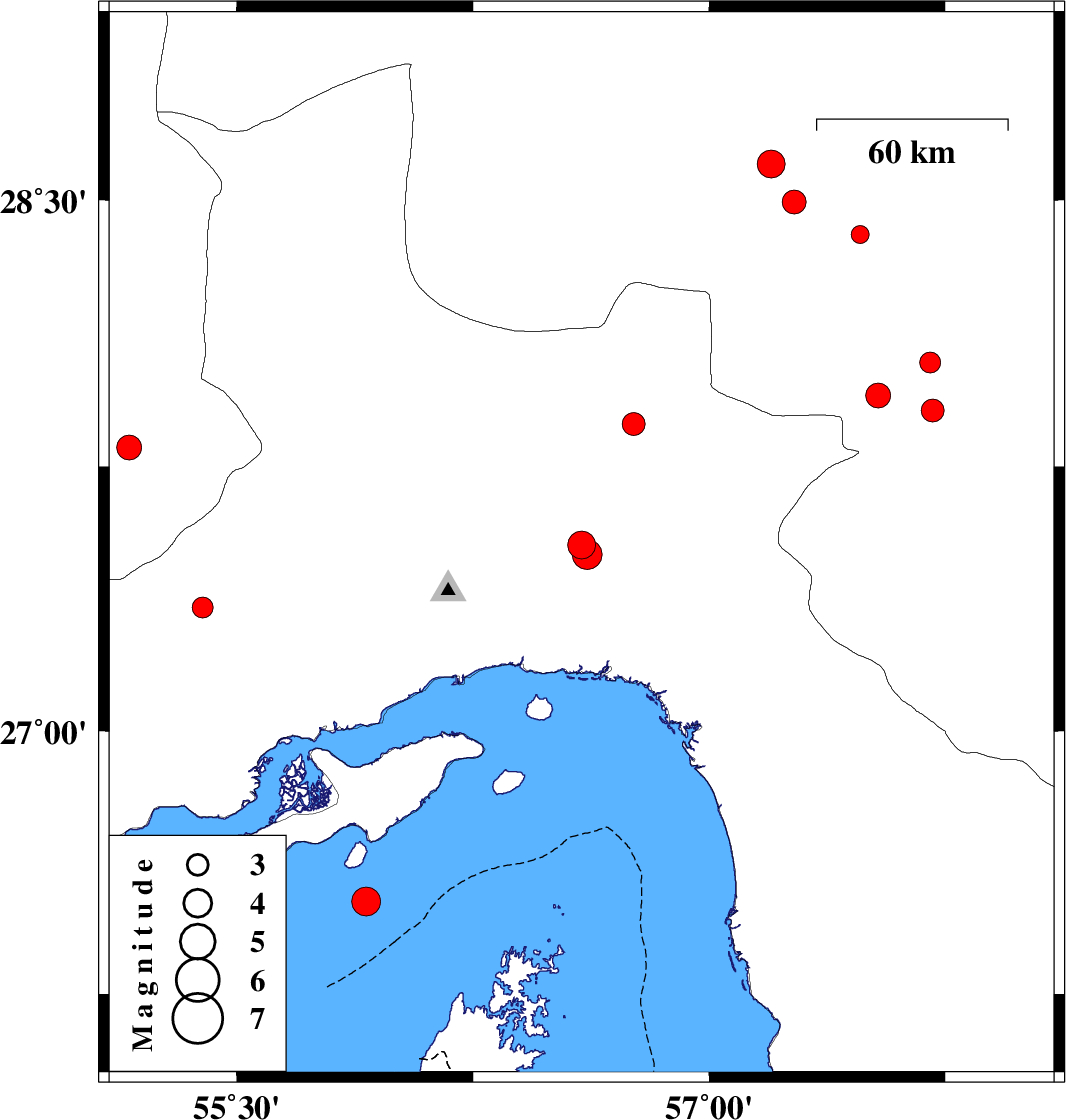 | 2015/08/12 | 03:36:56.6 | 08:06:56.6 | 27.351 | 55.392 | 18 | ML2.9 | Hormozgan Province, 90 km North-West of Bandar-e abbas |