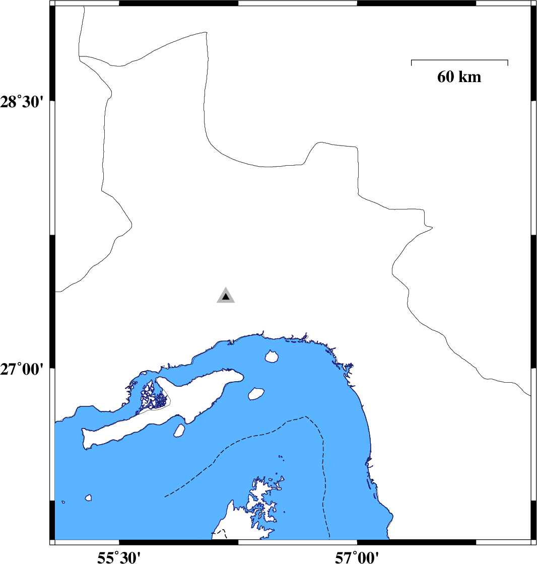 | 2015/09/04 | 04:28:26.6 | 08:58:26.6 | 27.87 | 56.76 | 14 | ML3.2 | Hormozgan Province, 68 km North-West of Dehbarez |
