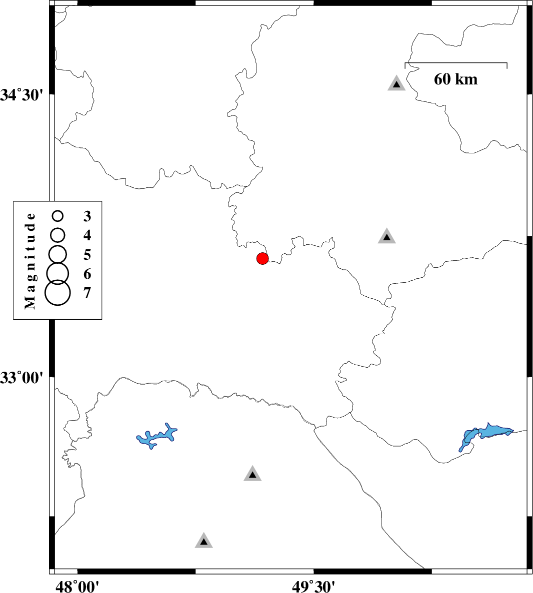 | 2015/09/09 | 02:26:05.2 | 06:56:05.2 | 33.466 | 49.354 | 8 | ML2.6 | Lorestan Province, 10 km -West of Azna | ||