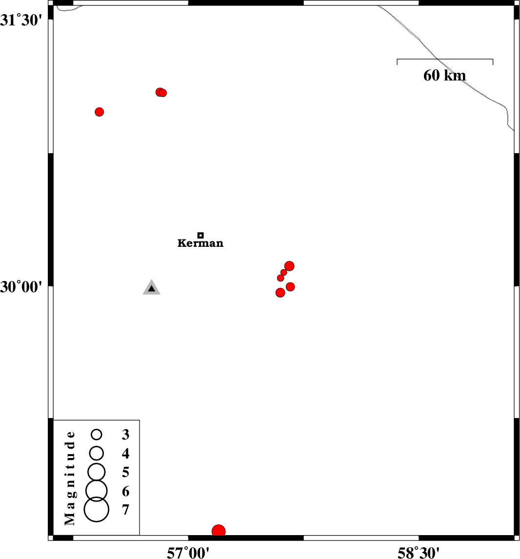 | 2015/09/04 | 15:32:31.5 | 20:02:31.5 | 29.963 | 57.598 | 15 | ML2.7 | Kerman Province, 62 km South-East of Kerman |