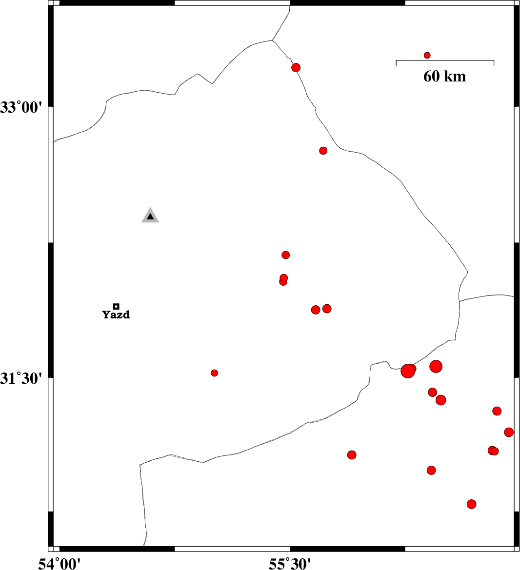 | 2015/09/10 | 09:36:54.6 | 14:06:54.6 | 32.182 | 55.472 | 14 | ML2.2 | Yazd Province, 65 km North of Bafq | ||