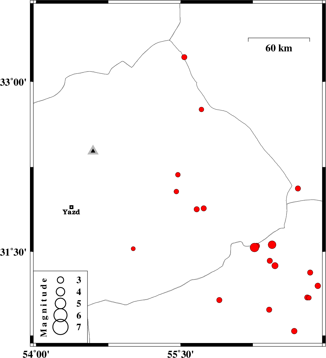 | 2015/09/10 | 09:36:54.6 | 14:06:54.6 | 32.182 | 55.472 | 14 | ML2.2 | Yazd Province, 65 km North of Bafq | ||