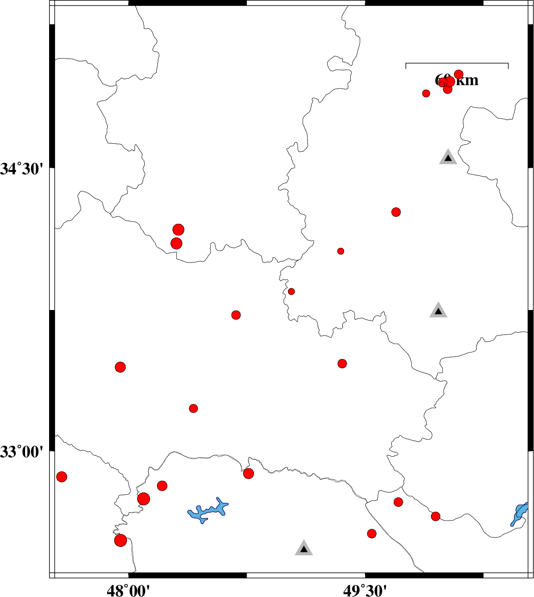 | 2015/08/14 | 20:26:46.1 | 00:56:46.1 | 33.724 | 48.681 | 15 | ML2.5 | Lorestan Province, 20 km South of Borujerd |