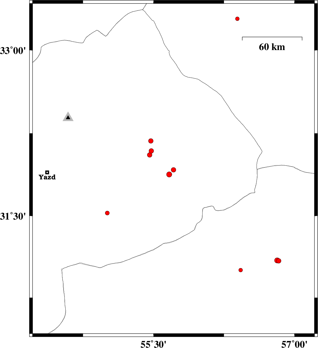 | 2015/09/13 | 09:42:59.7 | 14:12:59.7 | 32.091 | 55.476 | 14 | ML2.3 | Yazd Province, 55 km North of Bafq | ||