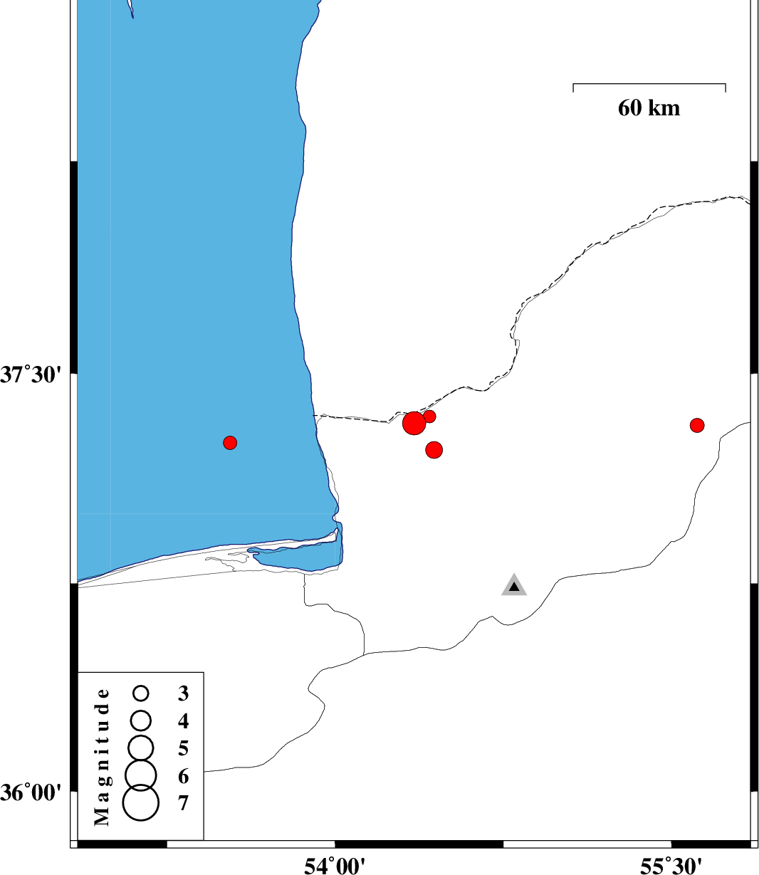 | 2015/09/11 | 08:13:02.6 | 12:43:02.6 | 37.227 | 54.441 | 15 | ML3.4 | Golestan Province, 24 km North of Aq Qaleh | ||