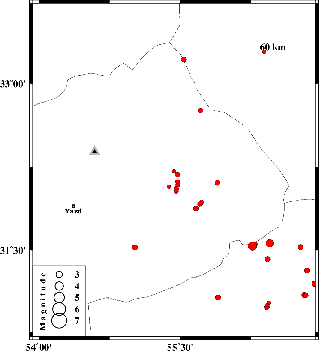 | 2015/09/10 | 09:36:54.6 | 14:06:54.6 | 32.182 | 55.472 | 14 | ML2.2 | Yazd Province, 65 km North of Bafq | ||