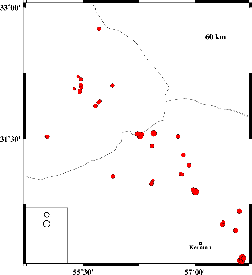 | 2015/09/16 | 22:03:54.1 | 02:33:54.1 | 30.539 | 57.383 | 14 | ML2 | Kerman Province, 40 km North-East of Kerman | ||