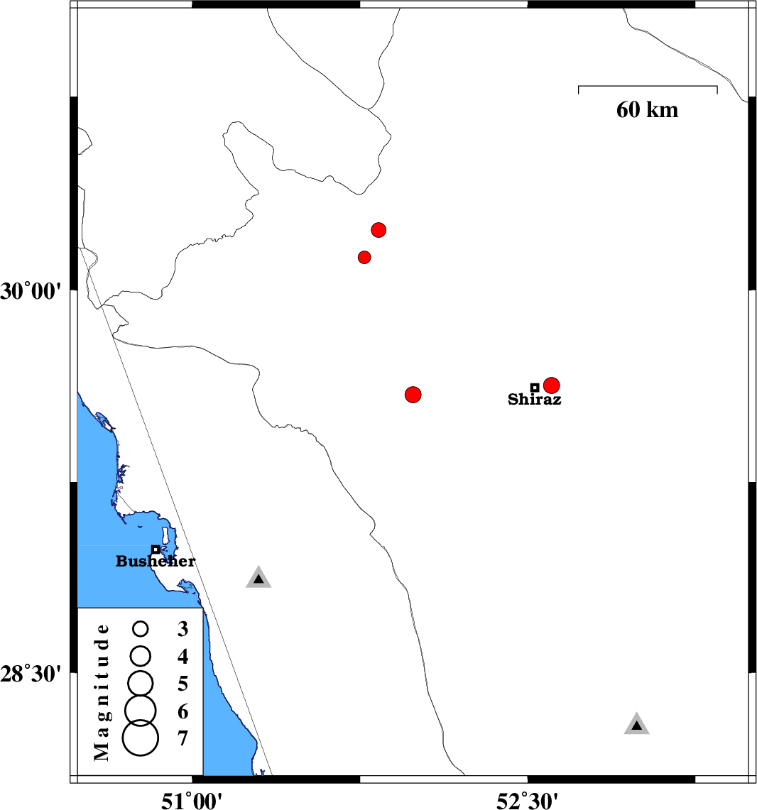 | 2015/09/21 | 04:20:15.3 | 08:50:15.3 | 29.592 | 51.987 | 18 | ML3.2 | Fars Province, 32 km -East of Kazerun | ||