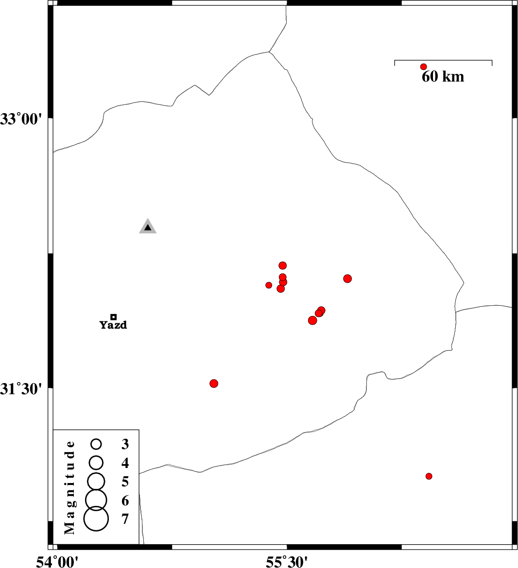 | 2015/09/17 | 09:04:26.1 | 13:34:26.1 | 32.073 | 55.381 | 14 | ML1.9 | Yazd Province, 52 km North of Bafq | ||