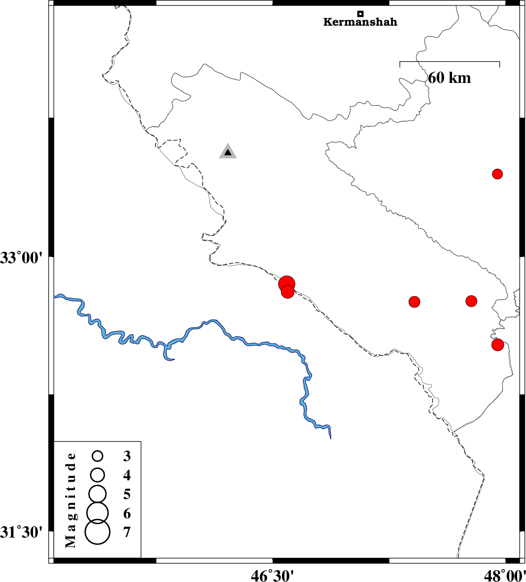 | 2015/09/25 | 09:28:01.7 | 12:58:01.7 | 32.809 | 46.597 | 18 | ML3.8 | Iraq, 53 km South-East of Mehran | ||