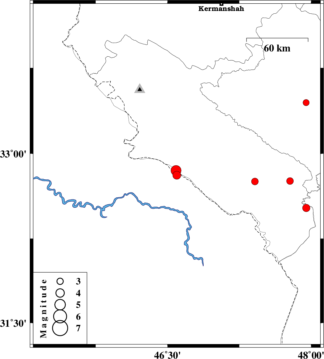 | 2015/09/25 | 09:28:01.7 | 12:58:01.7 | 32.809 | 46.597 | 18 | ML3.8 | Iraq, 53 km South-East of Mehran | ||