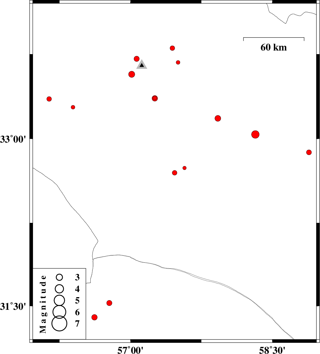 | 2015/09/26 | 00:02:14.9 | 03:32:14.9 | 32.741 | 57.572 | 15 | ML1.7 | Yazd Province, 113 km South-East of Tabas | ||