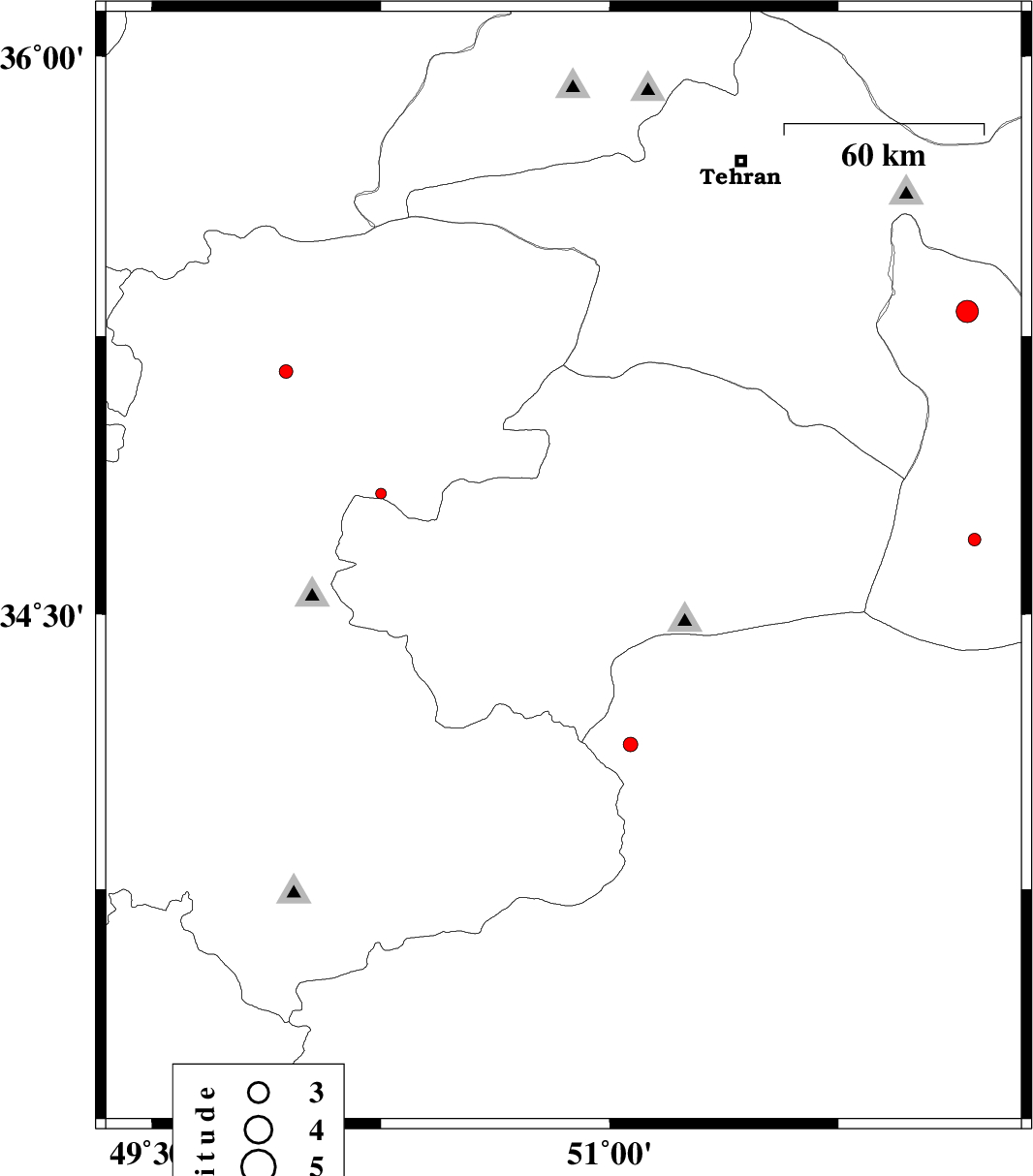 | 2015/09/21 | 09:00:50.3 | 13:30:50.3 | 35.784 | 51.952 | 15 | ML3.2 | Tehran Province, 13 km -West of Damavand |