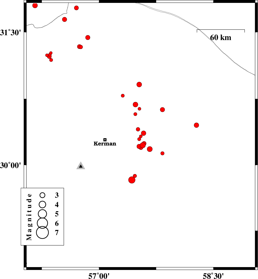 | 2015/09/24 | 10:11:06.2 | 13:41:06.2 | 30.391 | 57.603 | 14 | ML1.8 | Kerman Province, 52 km North-East of Kerman | ||