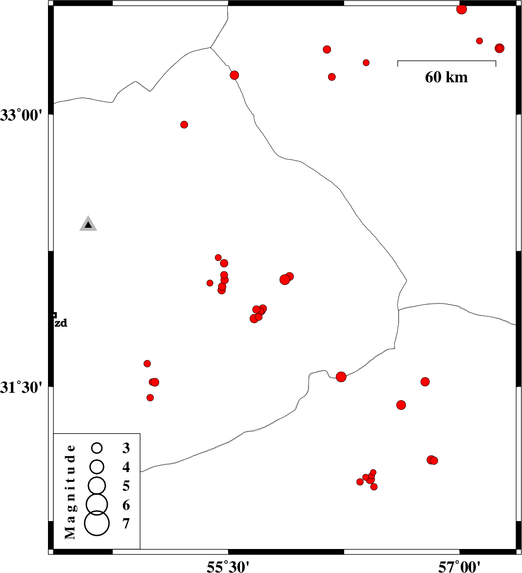 | 2015/09/05 | 00:20:29.9 | 04:50:29.9 | 33.214 | 55.539 | 15 | ML2.6 | Yazd Province, 180 km North-East of Bafq |